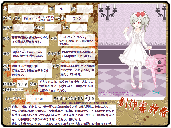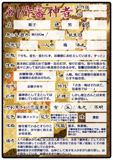 ○ 審神者双子のもう一つの可能性であり、卯ノ花は生まれることのなかった未結。生まれるに至った卯ノ花、即ち未結とその兄九繰の世界線においては、梔子は霊山の荒御魂(神)として人々に恐れられている。